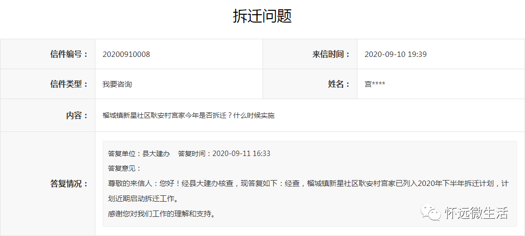 | 答复情况: | 答复单位:县大建办 答复意见: 尊敬的来信人:您好!经县大建办核查,现答复如下:经查,榴城镇新星社区耿安村宫家已列入2020年下半年拆迁计划,计划近期启动拆迁工作。 感谢您对我们工作的理解和支持。
