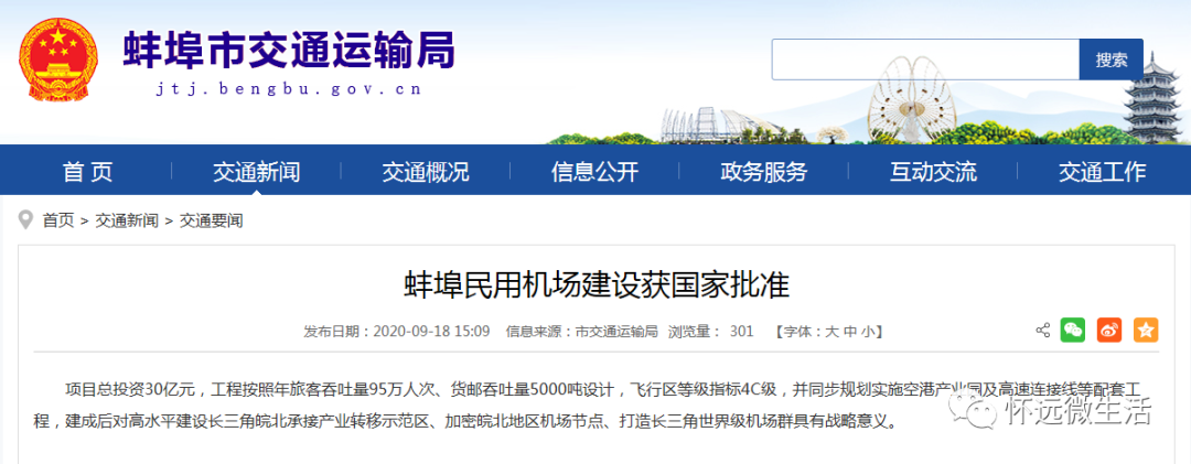9月18日蚌埠市交通运输局官方发布一则交通新闻,标题为“蚌埠民用机场建设获国家批准”,内容为“项目总投资30亿元,工程按照年旅客吞吐量95万人次、货邮吞吐量5000吨设计,飞行区等级指标4C级,并同步规划实施空港产业园及高速连接线等配套工程,建成后对高水平建设长三角皖北承接产业转移示范区、加密皖北地区机场节点、打造长三角世界级机场群具有战略意义。”意味着咱们蚌埠机场即将要投入建设。