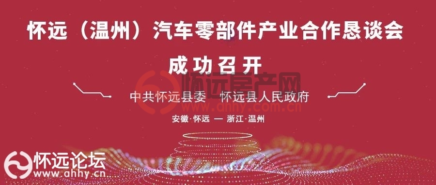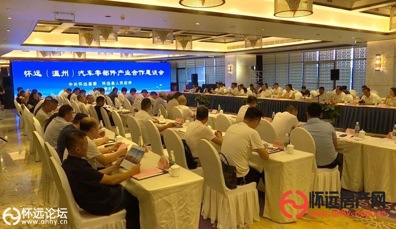 8月21日,怀远(温州)汽车零部件产业合作恳谈会在浙江温州成功召开。怀远县委书记汪若怀主持会议,县人大常委会主任邹运飞、县政协主席郭长富、副县长赵凯、县政协副主席随学文,及市、县相关部门负责同志出席会议。120家汽车零部件企业负责人参会,进行深度对接交流。